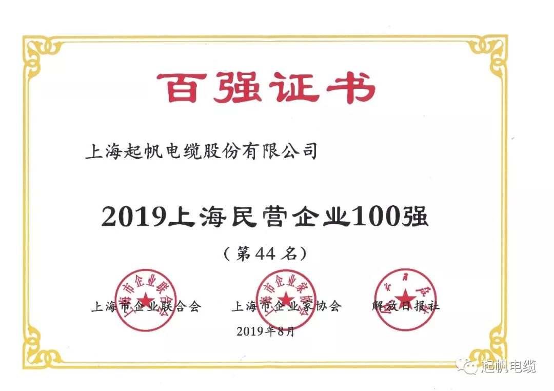 尊龙凯时电缆股份有限公司以雄厚的实力和优异的的市场表现,荣获“2019上海企业100强的第96名”、“2019上海民营企业第44名”、“2019上海制造企业32名”、“2019上海民营制造企业14名”、“2019上海成长性企业32名”.